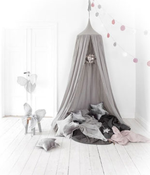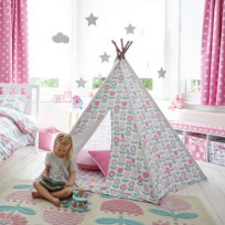 Совет: для вигвама в романтическом стиле используйте тюль 2 разных рисунков. Здесь крепление к палкам происходит с помощью клея. Однако это подойдёт лишь для девочек со спокойным характером, в противном случае ваши старания пойдут насмарку уже к вечеру. Вход в вигвам в детской может быть представлен простыми шторками, раздвигающимися в стороны, или закатанным к верху рулоном ткани.