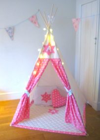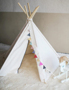 Нужна ли такая палатка для малыша? Этот вопрос интересует многих родителей, покупка обойдётся в кругленькую сумму. Тем не менее, современному малышу сложно обойтись без столь же современных игрушек, важно идти наравне со временем. Именно поэтому важно потратиться на детский вигвам для малышей, либо соорудить эту конструкцию своими руками. По сути, от вас потребуется лишь найти сухие толстые ветки или доски, оставшиеся от ремонта, плотная нить или ещё лучше – проволока (можно найти в любом строительном магазине или отделе «1000 мелочей»), а так же старенькая тюль или красивая простынь. Для декора можно использовать разные детали – пуговица, ленточки, банты, рисунки со старенькой одежды и пр.