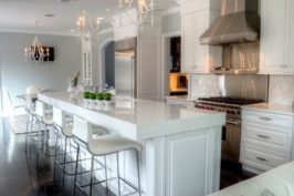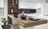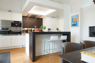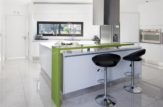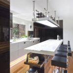 - Островная стойка с полезным функционалом. В такие модели чаще всего встраивается кухонная техника. Чаще всего, это духовой шкаф и/или морозильные камеры. Внешне это представлено частью кухонного гарнитура, точнее, его островной частью. По бокам от этой мебели располагаются стулья, а сама столешница имеет больший размер, чем форма шкафа, для того, чтобы за ней было удобно кушать. Этот вариант очень ярко и стильно смотрится в чёрно-белой цветовой гамме. Отлично подходит для людей любого возраста и достатка, так что стоит взять на вооружение.