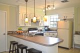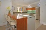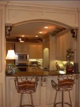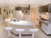 - Скругленная выделенная зона. В таком дизайне кухни с барной стойкой будет очень удобно использовать даже небольшие ниши. Начало столешницы всегда начинается от стены и заканчивается в части комнаты. Под ней чаще всего размещаются ящики и полки для хранения важных кухонных деталей. Тут же могут быть и открытые пространства в области коленей, к примеру. В нише можно поставить книги или чайные принадлежности, которыми вы чаще всего пользуетесь. Такой элемент неплохо комбинирует главное правило кухни – отсутствие углов за столом. Действительно, столешница со свободной стороны отличается закруглёнными формами.