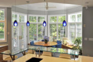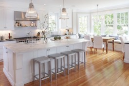 При подобном варианте дизайна помещения, стоит верно определиться с освещением. Лучше всего использовать точечное потолочное и потолочно-подвесное. Первый тип рассеивается по всей поверхности кухонной комнаты. Второй тип устраивается ровно над обеденным столом, чтобы была хорошая подсветка в этой области и при этом не было возможности задеть или стукнуться об люстру.