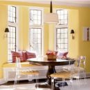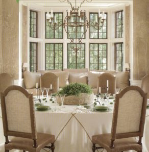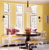 - Диван-подоконник, стол, стулья. Это наиболее интересное и практичное решение. Стол можно будет сдвигать и тогда появится простое ложе, где можно посидеть и отдохнуть. Оформить зону стоит в светлых тонах. Мягкие матрасы на широком подоконнике создадут ощущение мягкости. Дополнить это веяние нежности можно с помощью штор-жалюзи, низкосвисающей люстры, декоративными подушками и вазой с цветами на столе. Чтобы весь ансамбль гармонировал между собой, используйте одну ткань или один рисунок для штор, наволочек и обивки стульев. Стулья требуются для размещения на низ гостей, которые не уместятся на диване.
