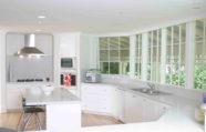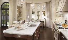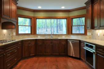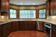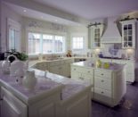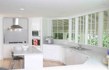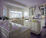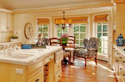 Большинство дизайнов кухонь с эркерами предлагают использовать выступающую часть в качестве места расположения мойки. Это действительно очень удобно, вы будете отвлекаться на более прекрасный вид, чем простая стена перед глазами, да и место под моющие средства значительно увеличивается. Однако следить за чистотой стёкол придётся постоянно, иначе брызги от воды будут застывать на окошках. Декорировать этот уголок стоит всё же не занавесками, а рулонными жалюзи, которые не развиваются и не мешают приведению посуды в порядок.