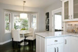 - Классические стол и стулья. Такой интерьер выглядит современно и строго, но достаточно открыто. Если у вас прекрасный вид из окна или соседние дома находятся поодаль, то от сокрытия окон можно отказаться, оставив стёкла свободными от тканей. Безусловно, и здесь стоит выбрать светлую цветовую гамму. Однако если в первом варианте приветствовалась пастельная гамма, вкрапления красок, то сейчас более уместными будут белый, серый и чёрный цвета. Но и дерево тут не помешает, например, в качестве напольного покрытия.