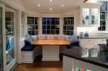 Эркеры могут быть самого разного размера и форм. Полукруг встречается чаще всего, но он не всегда крупный. Что же делать, если выступ небольшой, ставить тут диван – лишняя трата фантазии. Советуем вам выбрать в данном случае размещение в выступе кухонной мебели. Конечно, такой гарнитур сможет сделать не каждый производитель, но вы сможете получить отличное решение для себя и своей семьи. Столешница может проходить как прямо, так и образовывать нишу в кухне. Место под ней стоит использовать для хранения утвари.