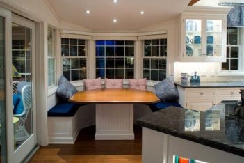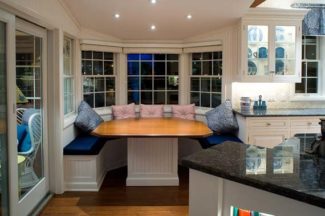 Все идеи декора помещения с выступом имеют своё значение. Однако очень интересной задумкой станет расположение на подоконнике мягкой области. Такую конструкцию можно с лёгкостью сделать своими руками или заказать вместе с кухонным гарнитуром. Последний вариант гораздо проще, а так же сможет гармонировать со всем интерьером благодаря фасадам. Поверх такого низкого дивана-комода укладывается высокий матрас по форме эркера и декорируется мягкими декоративными подушками.
