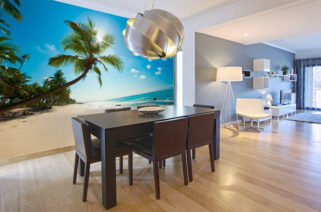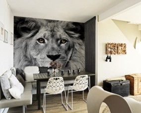 А вот размещать фотообои на стенах у окна или у входа менее разумно, но можно, если это позволяет рисунок. Либо сразу ищите варианты, которые бы могли декорировать подходящим образом и дверь. А вот у окна такой декор будет уместен только в том случае, когда вместо занавесок вы планируете использовать жалюзи. В противном случае весь рисунок будет перекрываться гардинами. Если ваш выбор – жалюзи, тогда рассмотрите варианты с фотопечатью в подходящей по смыслу тематике.