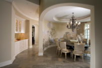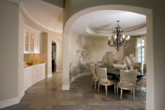 - Над рабочей поверхностью, вне зависимости от того, есть ли там подвесные шкафы. Этот вариант уместен и для больших и для среднего размера комнат. Дело в том, что если настенных шкафчики будут слишком массивными, рисунка попросту не будет видно, а необходимости в такой мебели нет у просторных помещений. Учитывая, что стена за столешницей чаще всего подвергается порче, её стоит дополнить стеклянным прозрачным фартуком.