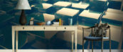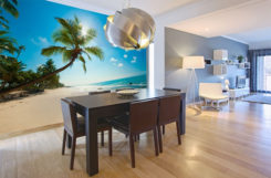 - Рыбки в аквариуме. Для этого цветовая гамма интерьера должна быть бело-синей. Светлый гарнитур, тёмная техника, синие кресла. Так же тёмный оттенком выделяется одна из стен между белой и фотообоями, на которых изображены плавающие в разные стороны рыбки. Очень интересно было бы вписать в картину необычные люстры, чем-то напоминающие морских ежей! Необычные силуэты и формы помогут вам дополнить весь интерьер и сделать его в морской стилистике;