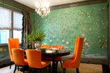 - Пьянящие пузырьки. В таком интерьере с рисунком высоких и огромных разноцветных рюмок с разными пузырьками, будет хорошо смотреться лёгкость гардин и тяжесть мебели. Простая тёмная мебель, возможно, стулья с белой кожаной или тканевой обивкой, люстра в виде облака или тучи, тёмный пол, – всё это не ухудшит игривость стен.