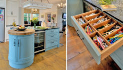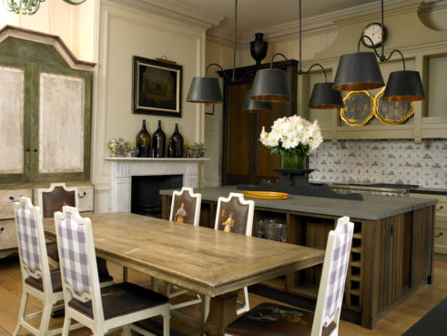 Интересное решение – установить в качестве островной зоны шкаф в стиле ретро. Таким образом вы соедините воедино современность и старину. Однако если найти такой предмет на барахолке не удалось, просто состарьте новый комод с помощью наждачной бумаги и одного слоя краски. Это делается очень просто. А дополнить интерьер помогут деревянные балки на потолке, полевые цветы в вазе и текстиль в цветочек. Получится романтический французский стиль Прованс.