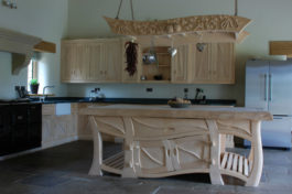 Но и это далеко не всё. Хотя, конечно, упомянутые варианты наиболее простые и по силам каждому из нас. Правда нельзя не отметить и тех мастеров по дереву, у которых просто золотые руки, без преувеличений! К примеру, смогли бы вы изготовить гарнитур своими руками с красивыми резными элементами и креативной формы? Так могут далеко не все, а вот иметь такую кухню в доме – предел мечтаний. Её останется лишь покрыть лаком, при желании, покрасить и она уже готова к использованию! Очень стильно смотрится с деревенской утварью и идеями для декора, в сочетании с современной серебряной мебелью.