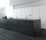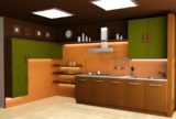 - Яркая или тёмная мебель. Лучше всего этот вариант смотрится в просторных комнатах. Прекрасно смотрятся на фасадах контрасты с белым цветом. Пол стоит выбрать в однотонном цвете, например, наливной или плитный. Стены можно покрасить, а фартук оформить керамикой или ПВХ панелями – это недорого и быстро. Что касается декоративных элементов, тут они могут быть неуместными. Лучше выбирать утварь в светлой гамме, чтобы не перегружать заданный дизайн. Сам гарнитур может состоять из: