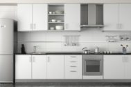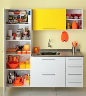 - Светлая мебель. Тут уместен ремонт и отделка поверхностей в той же цветовой гамме. Можно выбрать и другие цвета, но обязательно – светлой пастельной гаммы. Учитывая, что на кухонной столешнице располагается и варочная плита, и мойка, стоит стену во всю длину гарнитура отделать керамической плиткой. Пол можно покрыть ламинатом и проложить отопление, чтобы зимой было теплее. Стены не обязательно оклеивать обоями, можно выровнять и покрасить. Декор тут необходим яркого сочного цвета, чтобы не создавалось ощущение пустоты и замкнутости.