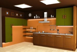 Но дизайн прямоугольной кухни на этом не заканчивается. Можно особое внимание уделить освещению. Для этого стоит присмотреть люстры необычной формы, окраса или подсветки. Но дизайнеры советуют использовать самые простые варианты, которые можно воплотить в жизнь своими руками за несколько минут. Вам потребуется несколько проводов яркого цвета, деревянная планка и крупные красивые лампочки. Соединив всё это в одну композицию и закрепив на потолке, вы сможете создать настоящий стильные декор, которого не найти больше ни у кого.