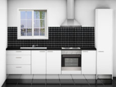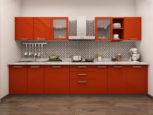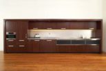 Прямой силуэт гарнитура ещё не говорит о том, что он должен быть небольшого размера. Можно приобрести двойную модель, широкую и вместительную. Располагается этот вариант по две противоположные стены комнаты, так что рабочего пространства здесь хоть отбавляй! На одной стороне можно установить раковину и плиту, на другой – полностью задействовать под столешницу.