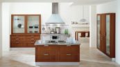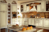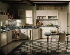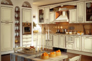Городской интерьер в итальянском направлении представляет собой смесь традиций с европейскими новшествами. Тут создаётся немного иная атмосфера, главное – избавиться от дверей в пользу создания проёма для перехода в гостиную или столовую. Окон должно быть много, чтобы в кухне было много солнечного света. Все или большинство проёмов лучше оформить в виде арки, а верхние шкафы мебели – стеклянными створками и перпендикулярными рейками. Посреди комнаты должен стоять красивый стол с каменной столешницей, на которую можно поставить кованую вазу для фруктов или поднос для вина.