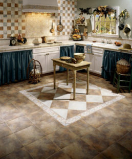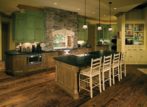 - Натуральные материалы. При этом можно сочетать три самых разных варианта – массивное дерево, кованый металл, глянцевый камень. На кухне особенно гармонично смотрится плитный пол, каменный «фартук» и столешница, лакированный стол и другая мебель, металлическая люстра, ручки гарнитура и элементы мебели.