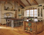 - Стены, пол и гарнитур – из дерева. Желательно подбирать один оттенок для отделки. Так же неплохо будет смотреться частичное покрытие потолка деревом, например, при наличии балок сверху для устойчивости второго этажа;