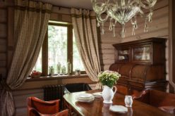 - Народное направление стилистики. Используйте максимальное приближение к деревенской жизни. Как же это понимать? Конечно, дерево используется за основу – пол, отделка стен, мебель и даже потолок нарочито подчёркнут. Нельзя упускать из вида и большой деревянный стол с удобными стульями. Дополнить интерьер поможет белый чайный сервиз, который можно установить на широкой открытой полке или на чайном столике. Обязательно оформите комнату живыми цветами из сада, окна украсьте шторами с гардинами. На полу чаще всего расстилается палас, который можно заменить ковром в области столовой зоны или выделить отделкой иным материалом. Это может быть сочетание дерева с линолеумом или красивой плиткой. Живописный рисунок позволит украсить интерьер наряду с красивой люстрой и иными деталями.