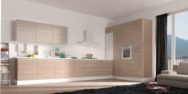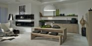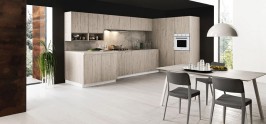 Вы первую очередь, дизайнеры советуют делать акцент на натуральности, экологии, приближённости к природе. Потому обязательно используйте дерево, привнося его в ваш интерьер. Конечно, самый распространённый вариант – фасады гарнитура. Но помимо них можно выбрать стол, всю мебель, пол, отделку стен и пр. Что касается фасадов, то они не обязательно должны быть натуральными. Вполне допускается покрытие плёнкой с фотопечатью, где изображена структура дерева.