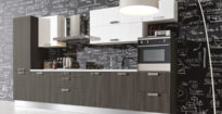 Такой стильный гарнитур неплохо смотрится с чёрным или белым камнем, металлом. Создавайте контрасты, отталкиваясь от оттенка фасадов. Если это светло-коричневый тон, то дополнительным цветом должен стать чёрный. Однако всегда можно добавить 2 дополнительных колора, например: