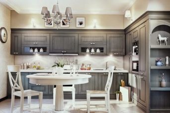 - Круглый стол в центре или углу комнаты. Округлённость форм была важным требованием ещё у наших предков, считалось, что за таким столом никто не будет ругаться. Подобный дизайн кухни в современном стиле идеален для средних и небольших комнат. Если же помещение совсем крохотное, то столик может быть угловым или раскладным. Главное, чтобы тут собирались за трапезами все члены семьи, проживающие на одной территории. Старайтесь держать столешницу в идеальном порядке, особенно, если её поверхность глянцевая, и каждый дефект сразу виден.