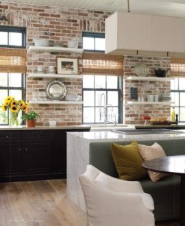 Очень ярко смотрится кухонный фартук, выложенный из кирпича. Если это не стиль лофт, то здесь лучше заменить настоящий кирпич аналогами, что и облегчит стену в результате, и не будет выпирать внутрь помещения слишком сильно. Вариантов для фартука много: